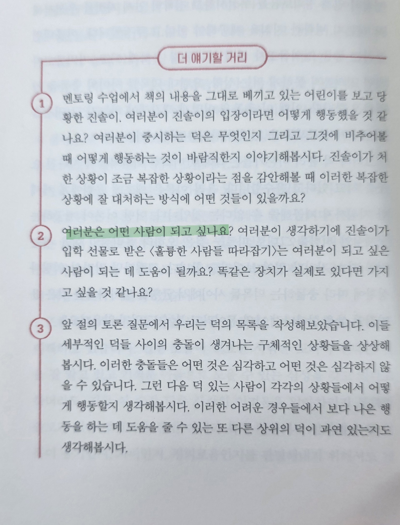 2. 정답 없는 질문에 답하기: 윤리와 가치는 수학 문제처럼 정답이 없기에 더욱 치열하게 대화하고 서로의 입장을 조정해야 합니다.