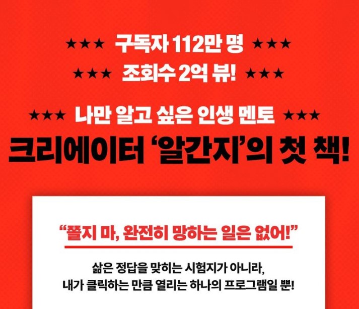 🎬 "알간지?" 그가 던지는 묵직한 돌직구 누군가는 그를 통쾌한 유머로 기억하고, 누군가는 날카로운 통찰로 기억합니다. 112만 구독자의 멘탈을 관리해 온 알간지가 이번엔 책을 통해 우리에게 묻습니다. "언제까지 곁눈질하며 정답만 찾고 있을 거냐"고요.